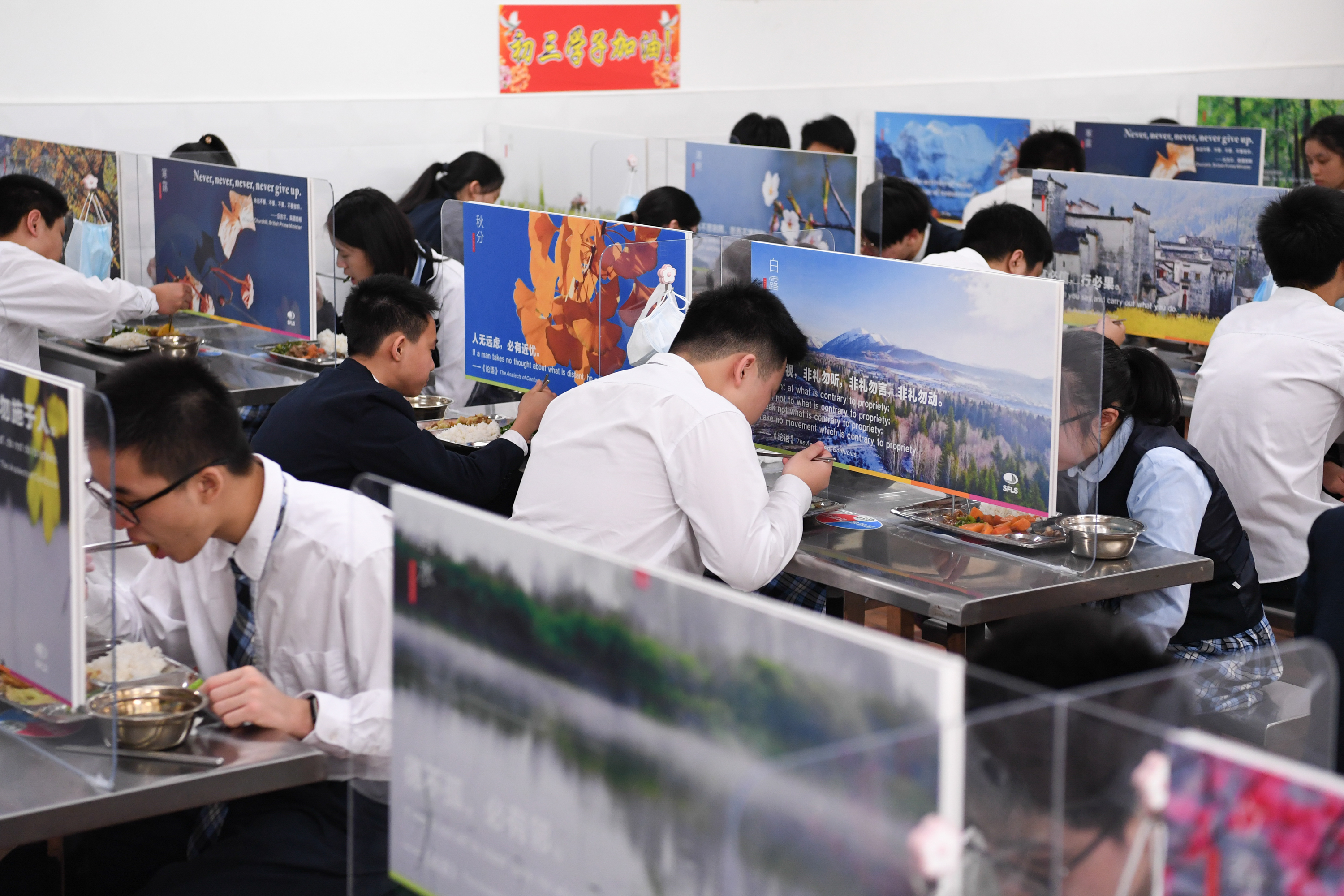 Students of grade 9 have lunch in the dining hall of Shenzhen Foreign Languages School in Shenzhen, south China's Guangdong Province, April 27, 2020. (Xinhua/Liang Xu)