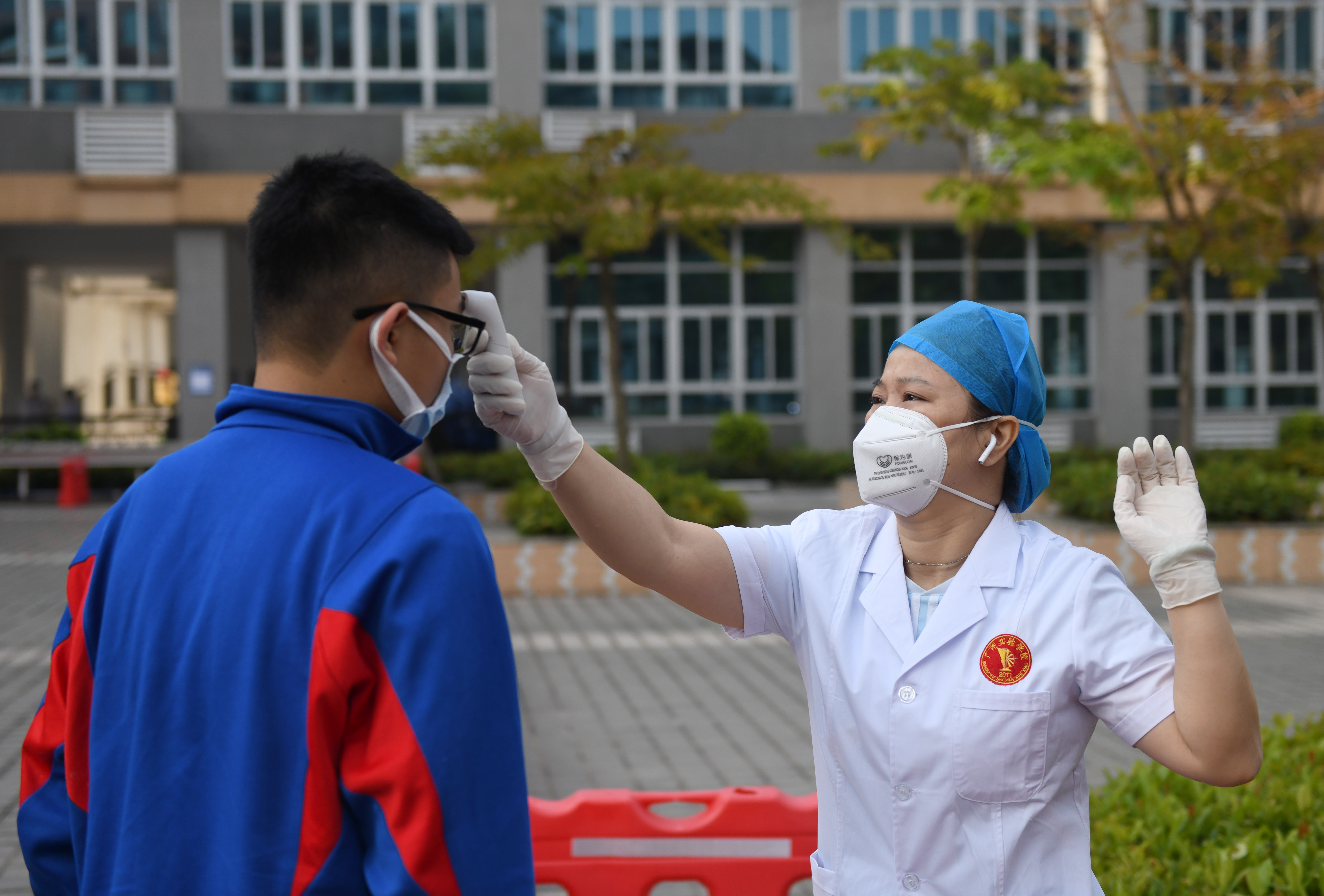 A student of grade 9 has his body temperature measured at a middle school in Guangzhou, south China's Guangdong Province, April 27, 2020. (Xinhua/Lu Hanxin)