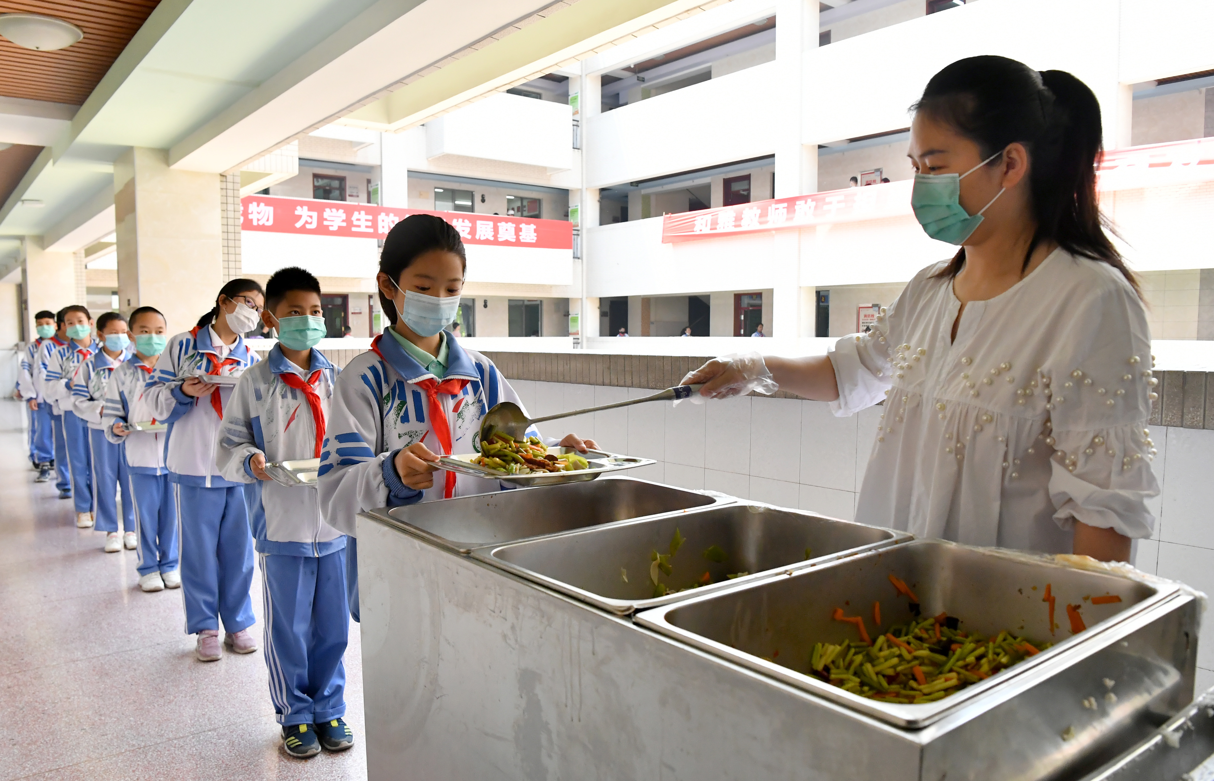 Students wait in line to get their meals at Shaanxi Normal University Jinyuan Primary School in Xi'an, northwest China's Shaanxi Province, April 27, 2020. (Xinhua/Liu Xiao)
