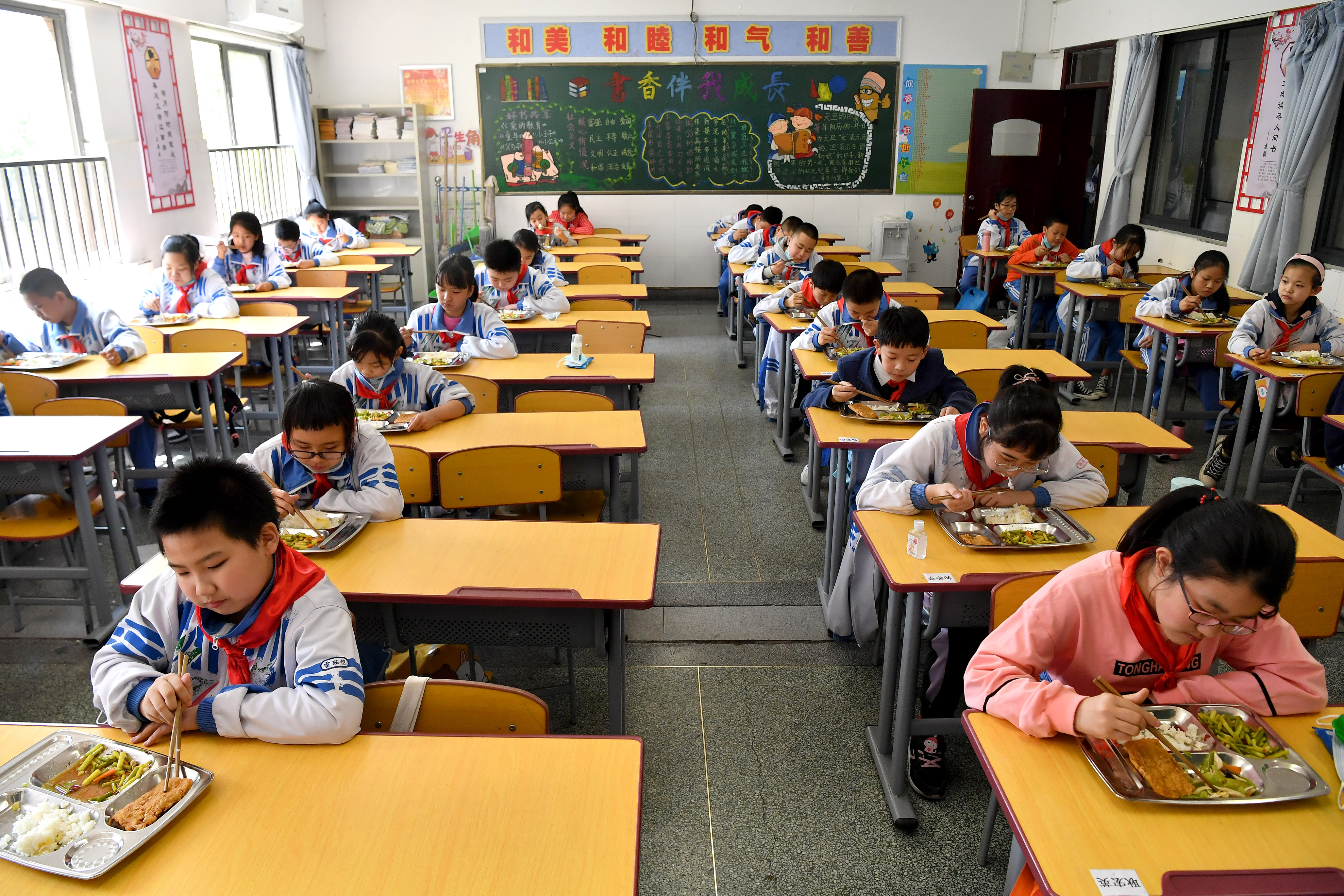 Students have lunch at Shaanxi Normal University Jinyuan Primary School in Xi'an, northwest China's Shaanxi Province, April 27, 2020. (Xinhua/Liu Xiao)