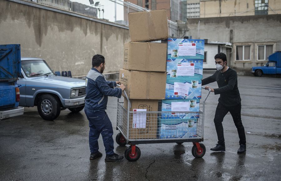 Staff of Iran's Ministry of Health and Medical Education arrange boxes of donated masks by China in Tehran, Iran, on Feb. 25, 2020. (Photo by Ahmad Halabisaz/Xinhua)
