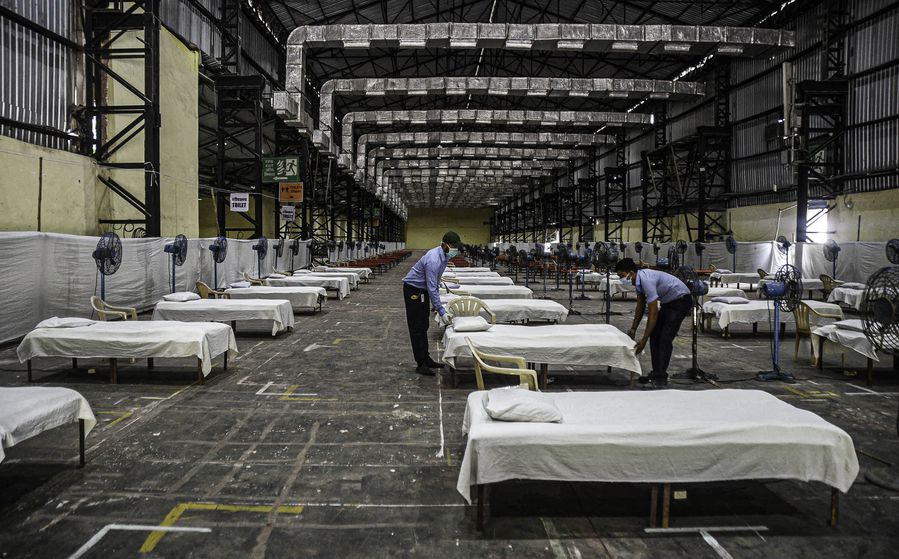 Municipal officers set up beds at an isolation center during a nationwide lockdown in Mumbai, India, April 27, 2020. (Str/Xinhua)