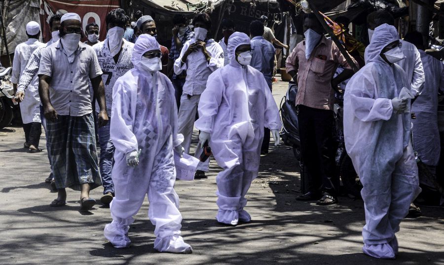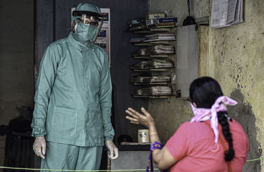 Healthcare workers at residential area check residents during a nationwide lockdown to slow the spreading of COVID-19 in Mumbai, India, April 27, 2020. (Str/Xinhua)