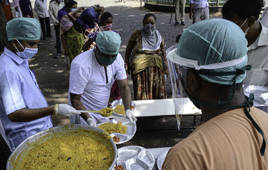 People distribute food to the migrants during the lockdown as a preventive measure to slow the spread of COVID-19 in Mumbai, India, April 27, 2020. (Str/Xinhua)