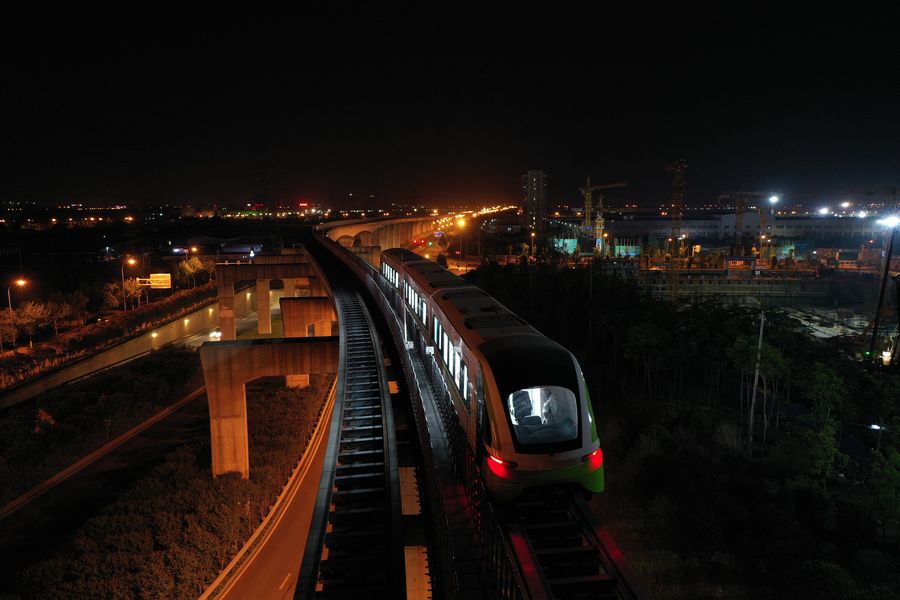Aerial photo taken on April 28, 2020 shows a new generation domestic medium-low-speed magnetic levitation (maglev) train in a speed test in Changsha, central China's Hunan Province. The train reached a top speed of 160 km per hour and passed a medium-speed test Tuesday in Changsha, a major step before it begins formal operations. (Xinhua/Li Tie)