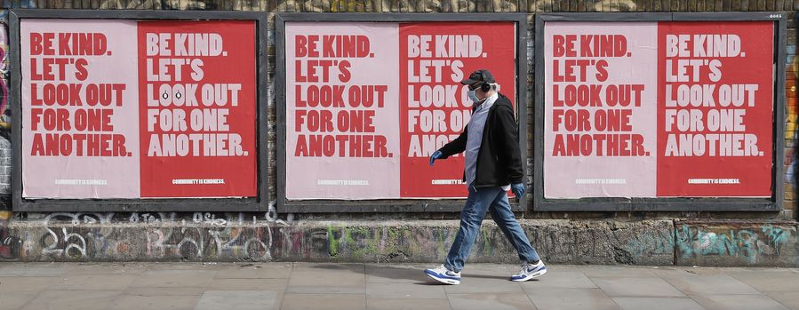 A man wearing a face mask walks on a street in London, Britain on April 26, 2020. (Xinhua/Han Yan)