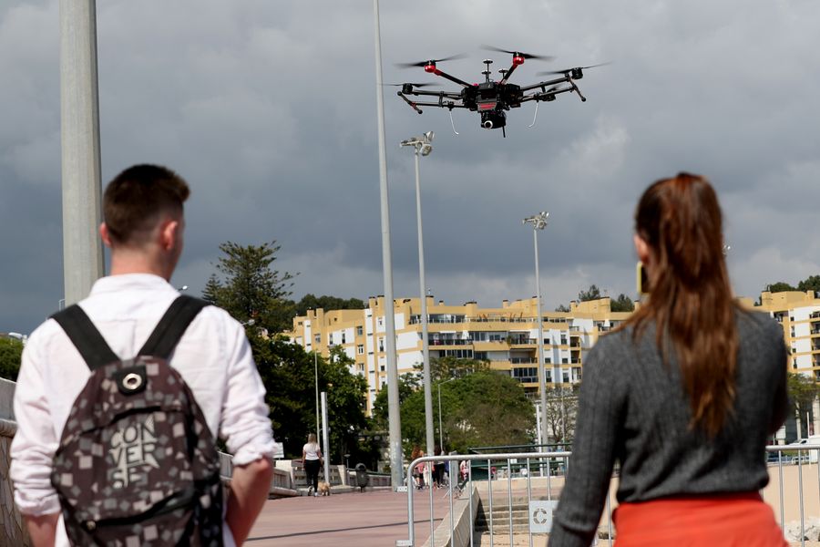 A drone with a loudspeaker warning people to stay at home is seen flying during an awareness-raising operation to prevent the spread of the COVID-19 in Oeiras, Portugal on April 26, 2020. (Photo by Pedro Fiuza/Xinhua)