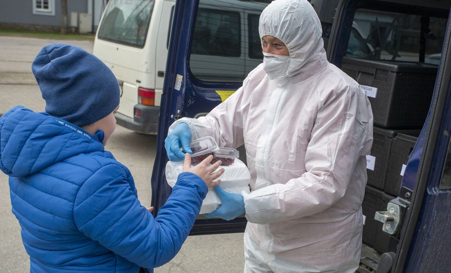 A staff member distributes free food to a child from low-income household in Ogre, Latvia, April 20, 2020. Latvia has prolonged the state of emergency till May 12. (Photo by Janis/Xinhua)
