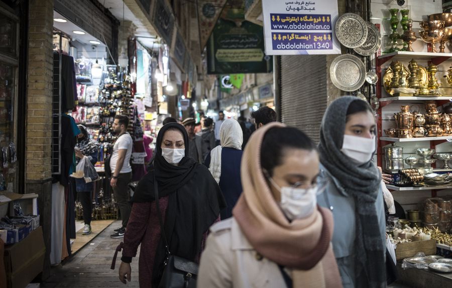 Women wearing face masks walk at a bazaar in Tehran, Iran, on April 24, 2020. (Xinhua/Ahmad Halabisaz)
