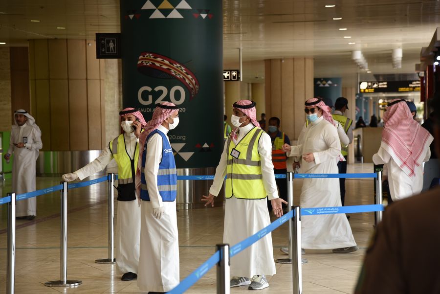 Staff members wearing face masks work at the King Khalid International Airport in Riyadh, Saudi Arabia, on April 15, 2020. (Xinhua/Tu Yifan)