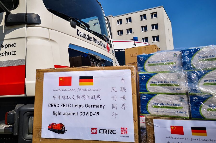 Photo taken with a mobile phone on April 24, 2020 shows medical equipment donated by China Railway Rolling Stock Corporation (CRRC) Zhuzhou Locomotive Co. Ltd. in Berlin, Germany. (CRRC ZELC/Handout via Xinhua)