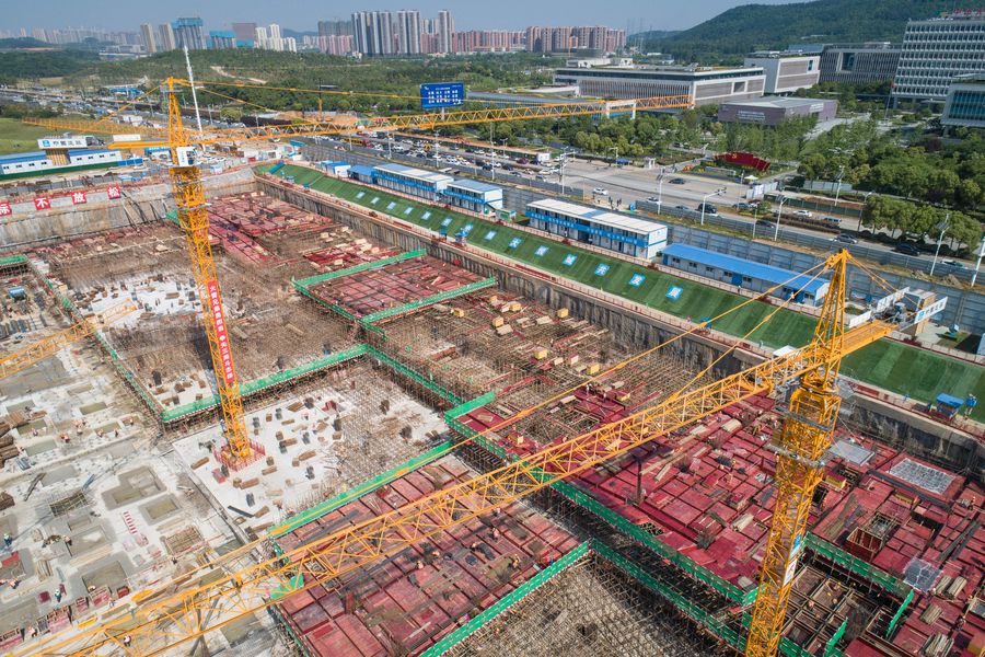 Workers work at the construction site of Joy City building complex in Wuhan, central China's Hubei Province, April 28, 2020. (Xinhua/Xiao Yijiu)