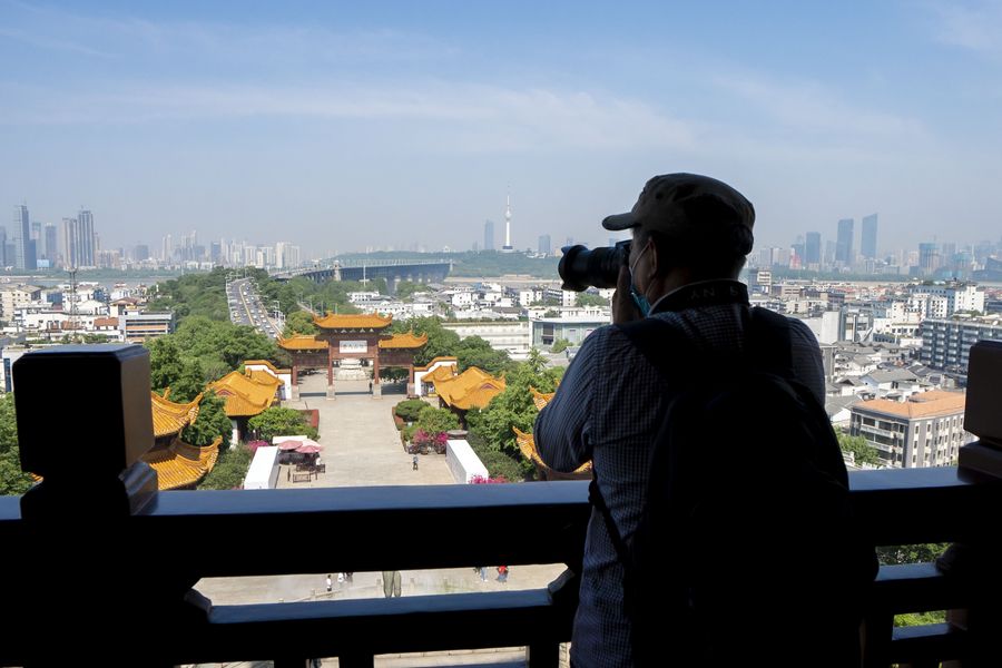 A tourist visits the Yellow Crane Tower, or Huanghelou, a landmark in Wuhan, central China's Hubei Province, April 29, 2020. (Xinhua/Xiong Qi)