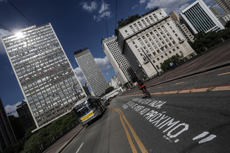 Vehicles pass by an artistic slogan written in Portuguese meaning "the city is not empty, it is full of love for neighbor #stay home" amid the COVID-19 pandemic in Sao Paulo, Brazil, on April 21, 2020. (Xinhua/Rahel Patrasso)