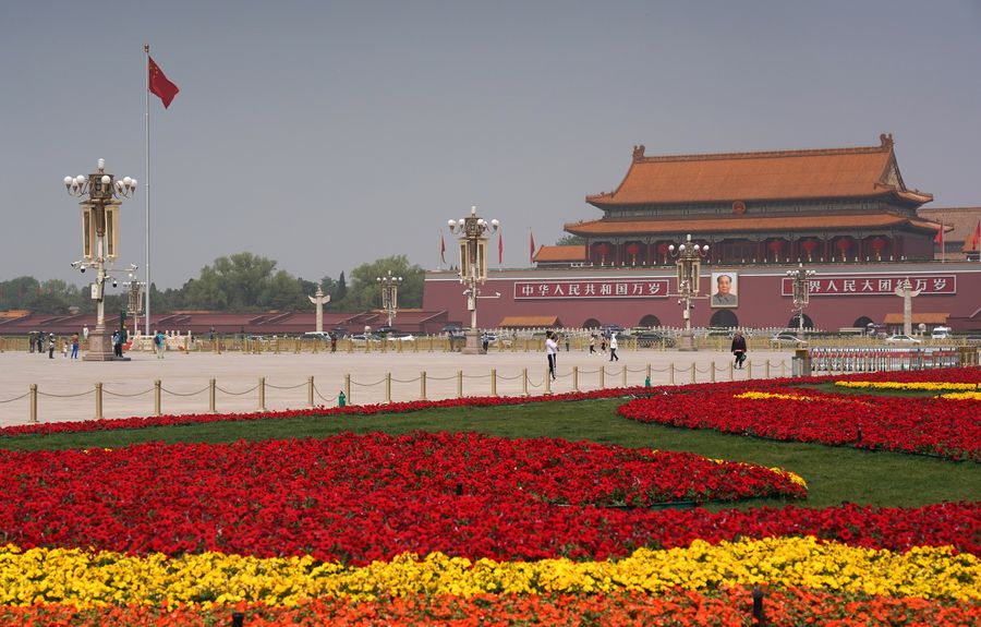 Photo taken on April 30, 2020 shows flower beds to celebrate the upcoming International Labor Day at Tian'anmen Square in Beijing, capital of China. (Xinhua/Ju Huanzong)