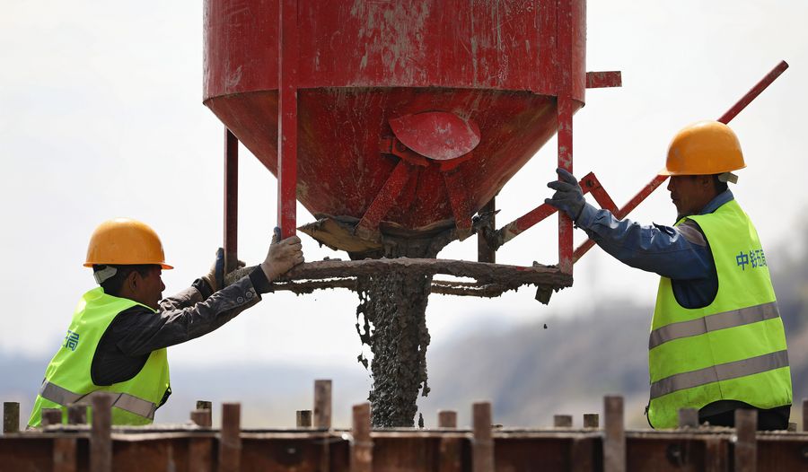 Workers work at the construction site of the New Xihu Bridge in Benxi, northeast China's Liaoning Province, April 28, 2020. (Xinhua/Yao Jianfeng)