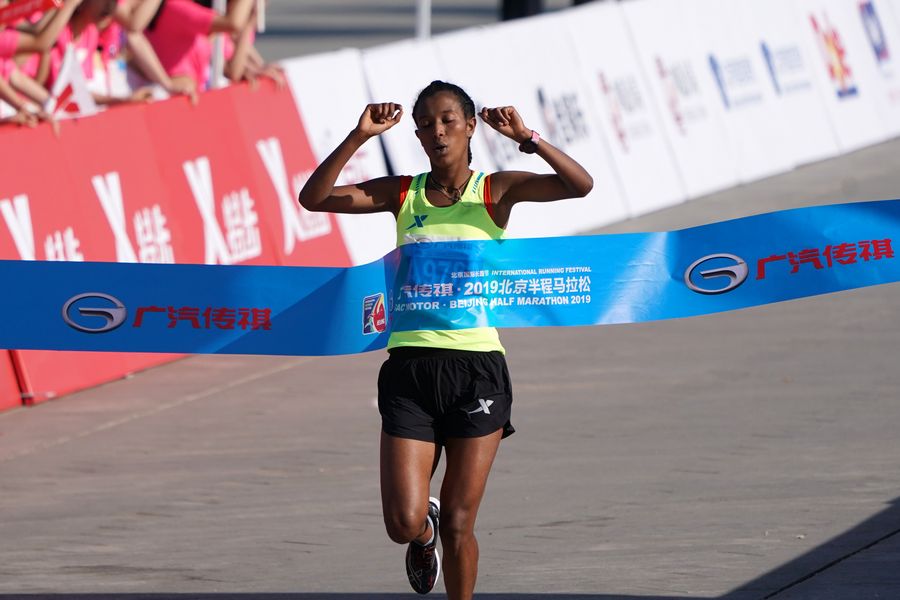 Chernet Misganaw Takele of Ethiopia crosses the finish line during the 2019 Beijing Half Marathon in Beijing, capital of China, April 14, 2019. Chernet Misganaw Takele of Ethiopia claimed the title of the women's event. (Xinhua/Ju Huanzong)