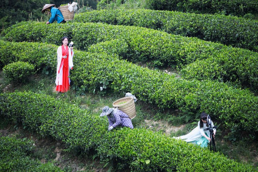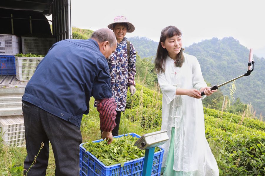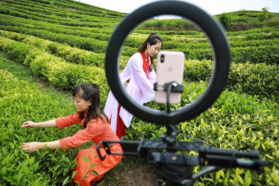 Mao Huayan (2nd L) and Li Jiali (R) present tea picking via livestreaming at a tea garden of Chunjing Village in Baini Town, Yuqing County, southwest China's Guizhou Province, April 30, 2020. (Xinhua/Liu Xu)