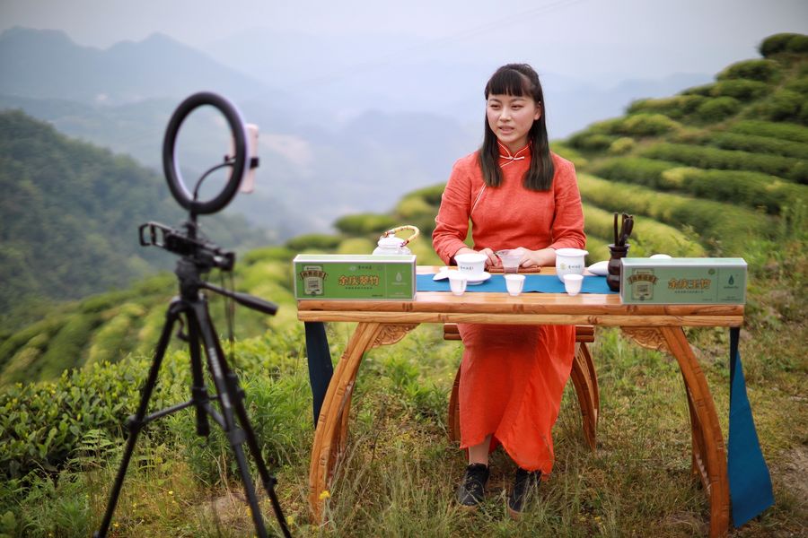 Li Jiali presents tea art via livestreaming at a tea garden of Chunjing Village in Baini Town, Yuqing County, southwest China's Guizhou Province, April 30, 2020. (Xinhua/Liu Xu)