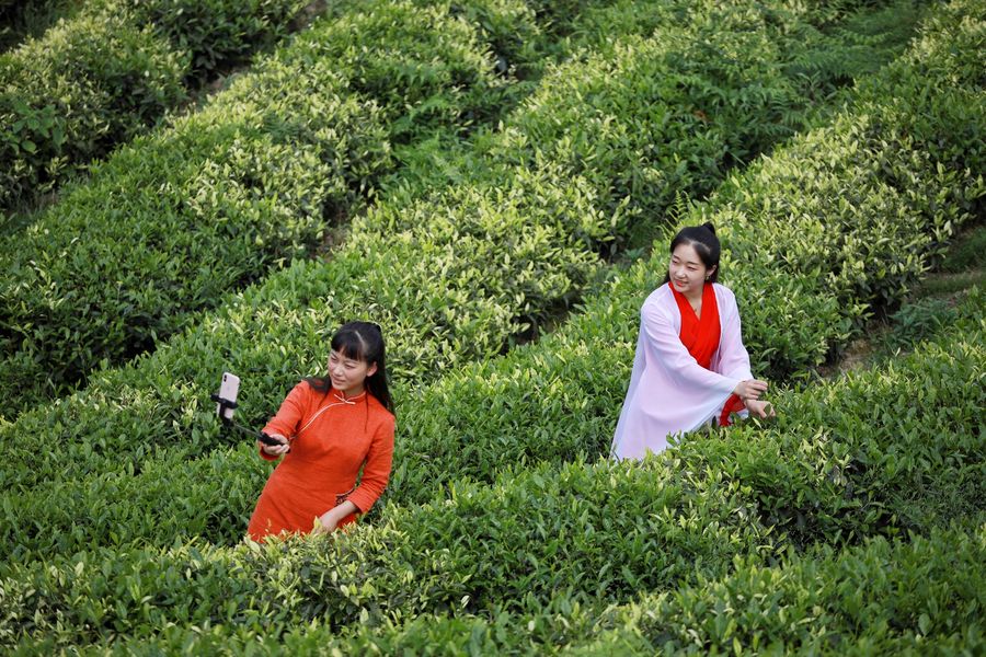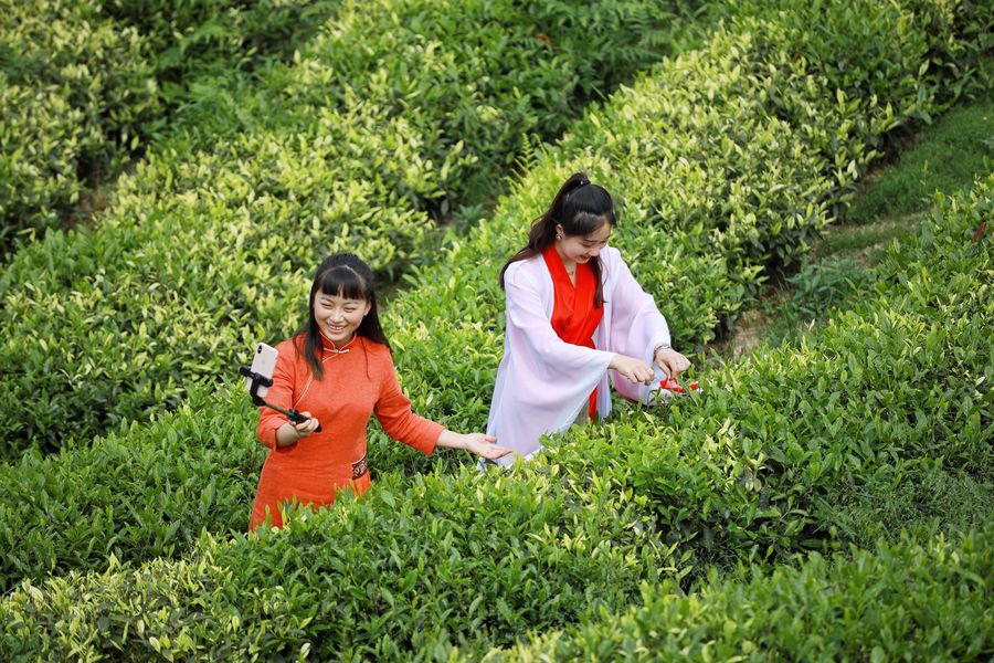 Mao Huayan (R) and Li Jiali present tea picking via livestreaming at a tea garden of Chunjing Village in Baini Town, Yuqing County, southwest China's Guizhou Province, April 30, 2020.(Xinhua/Liu Xu)