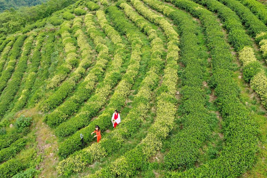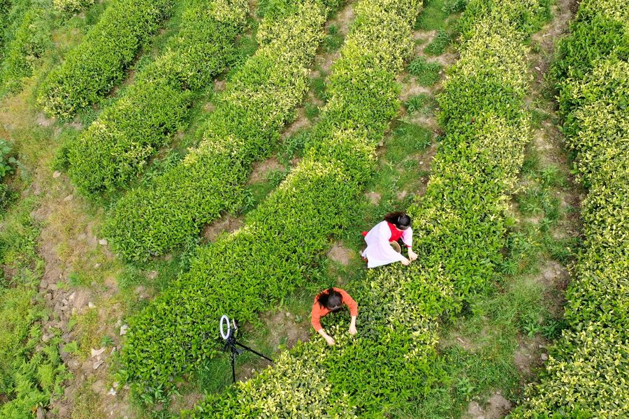 Mao Huayan (R) and Li Jiali present tea picking via livestreaming at a tea garden of Chunjing Village in Baini Town, Yuqing County, southwest China's Guizhou Province, in this aerial photo taken on April 30, 2020(Xinhua/Liu Xu)■