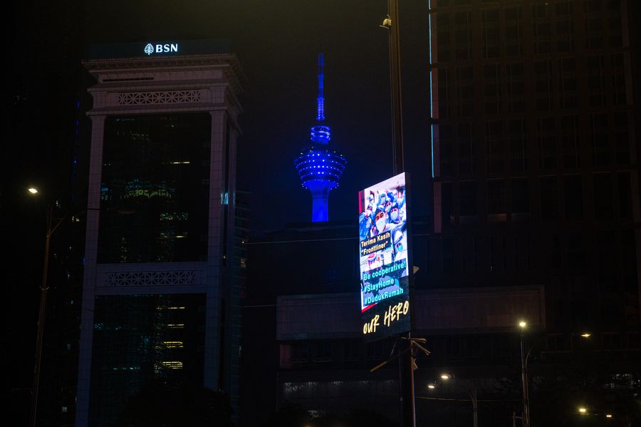 The Petronas Twin Towers are lit in blue to show support for frontline healthcare workers against the COVID-19 pandemic in Kuala Lumpur, Malaysia, on April 30, 2020. (Xinhua/Zhu Wei)