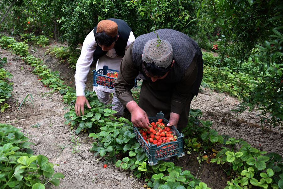 Farmers harvest strawberries at a field in Arghandab district of southern Kandahar province, Afghanistan, April 29, 2020. (Xinhua/Sanaullah Seiam)