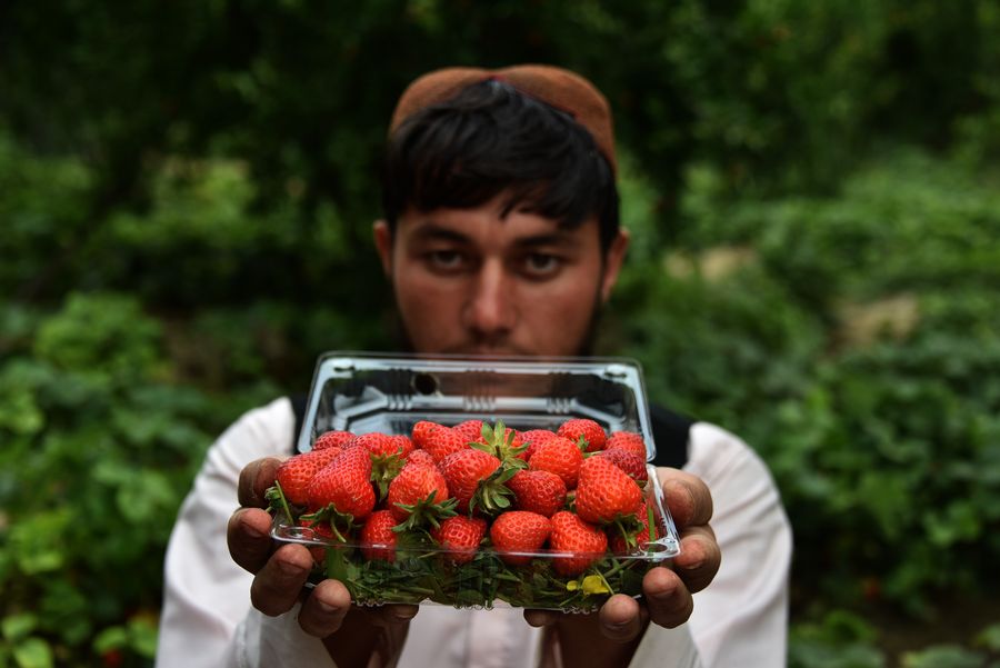 A farmer shows freshly-picked strawberries at a field in Arghandab district of southern Kandahar province, Afghanistan, April 29, 2020. (Xinhua/Sanaullah Seiam)