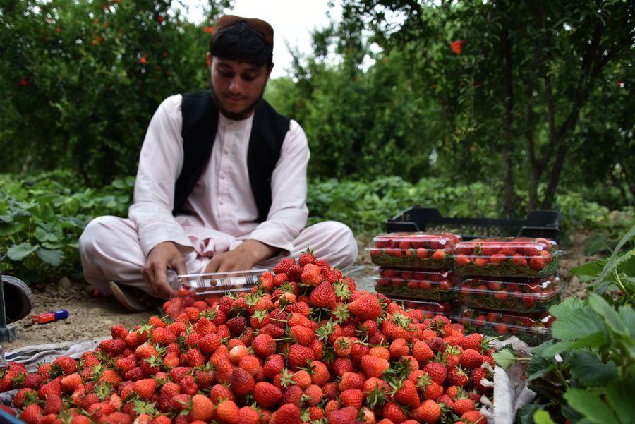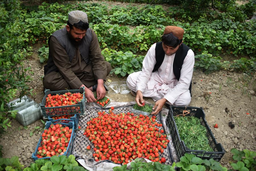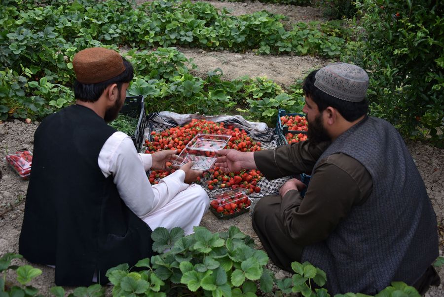 A farmer packages freshly-picked strawberries at a field in Arghandab district of southern Kandahar province, Afghanistan, April 29, 2020. (Xinhua/Sanaullah Seiam)