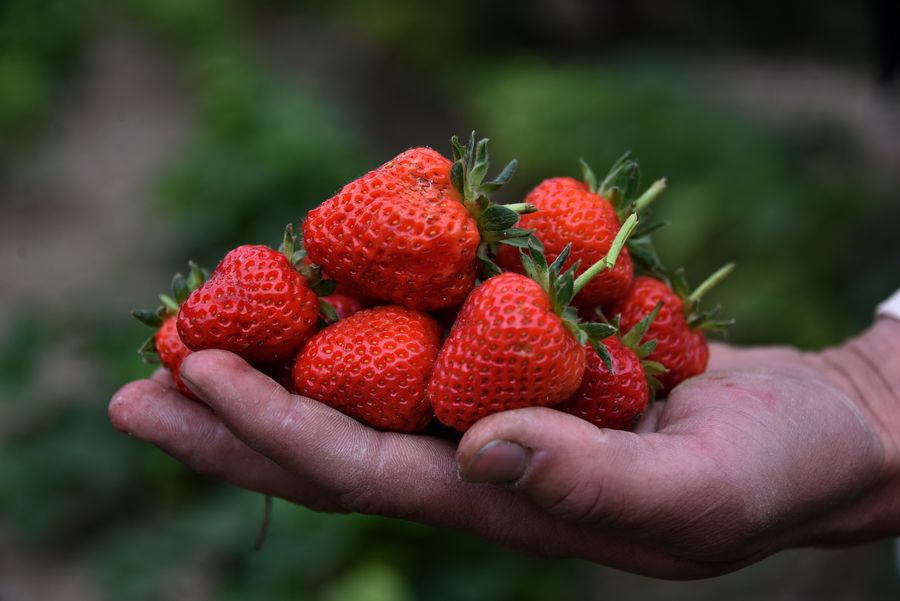 A farmer shows freshly-picked strawberries at a field in Arghandab district of southern Kandahar province, Afghanistan, April 29, 2020. (Xinhua/Sanaullah Seiam) ■