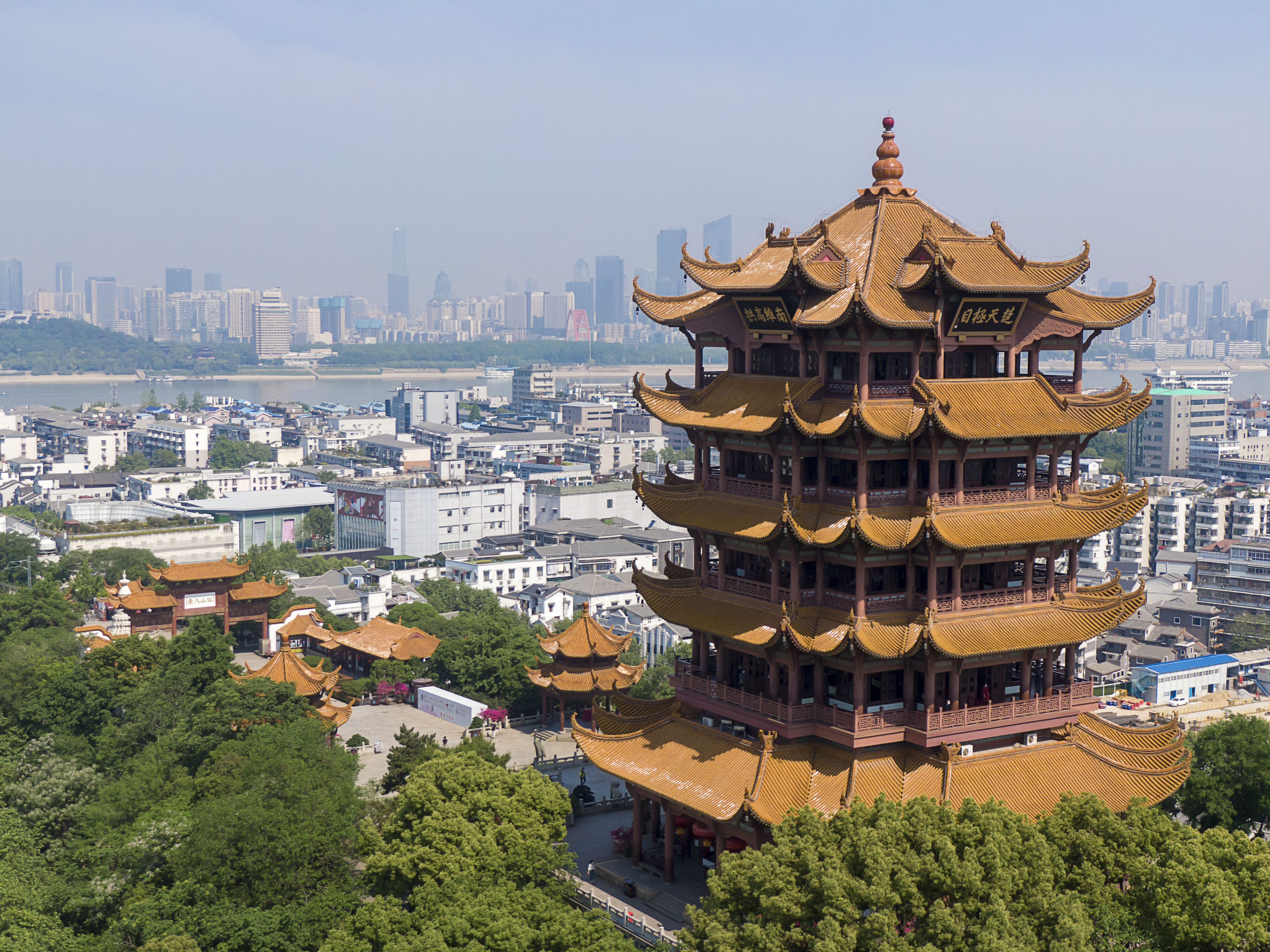 Aerial photo taken on April 29, 2020 shows the Yellow Crane Tower, or Huanghelou, a landmark in Wuhan, central China's Hubei Province. (Xinhua/Xiong Qi)