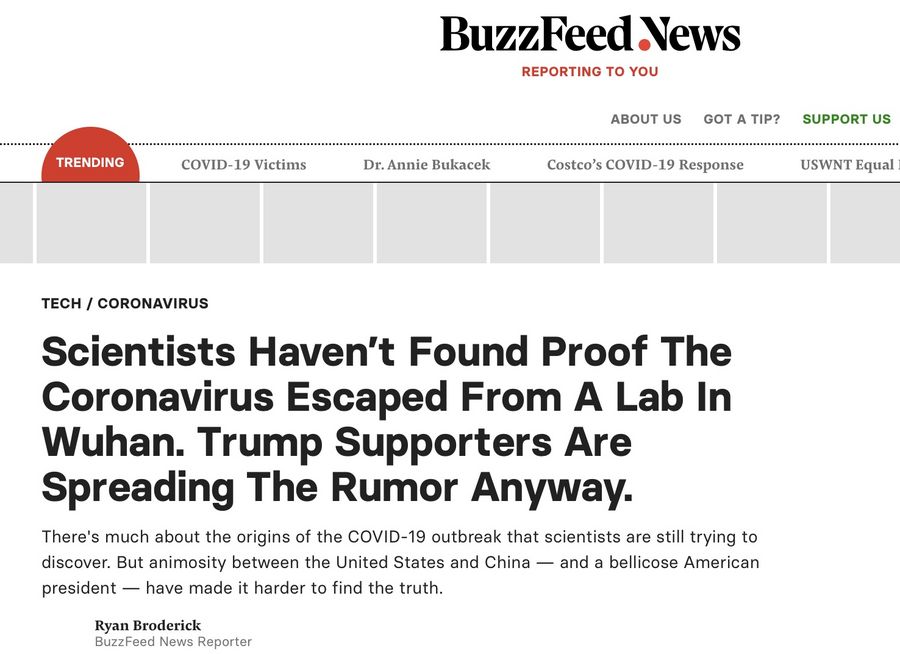 The piece, written by reporter Ryan Broderick and based on interviews with several scientists, is titled "Scientists Haven't Found Proof The Coronavirus Escaped From A Lab In Wuhan. Trump Supporters Are Spreading The Rumor Anyway."