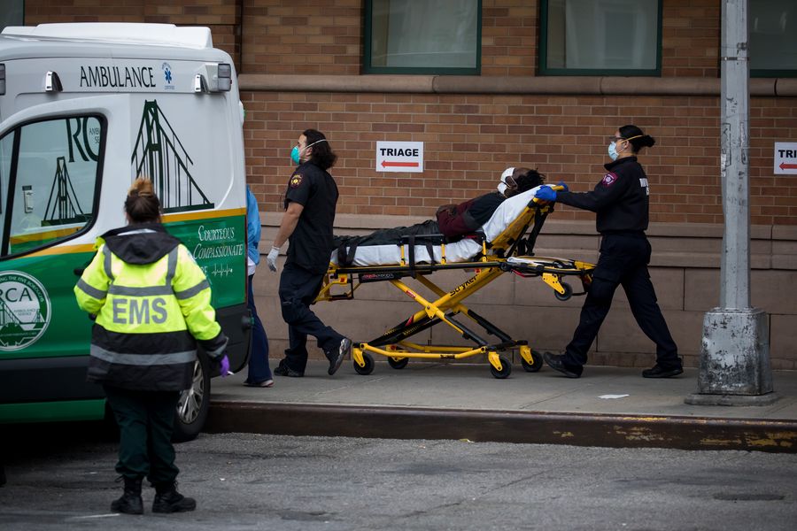 Healthcare workers wheel a patient to a triage tent at the Maimonides Medical Center in the Brooklyn borough of New York, the United States, April 19, 2020. (Photo by Michael Nagle/Xinhua)