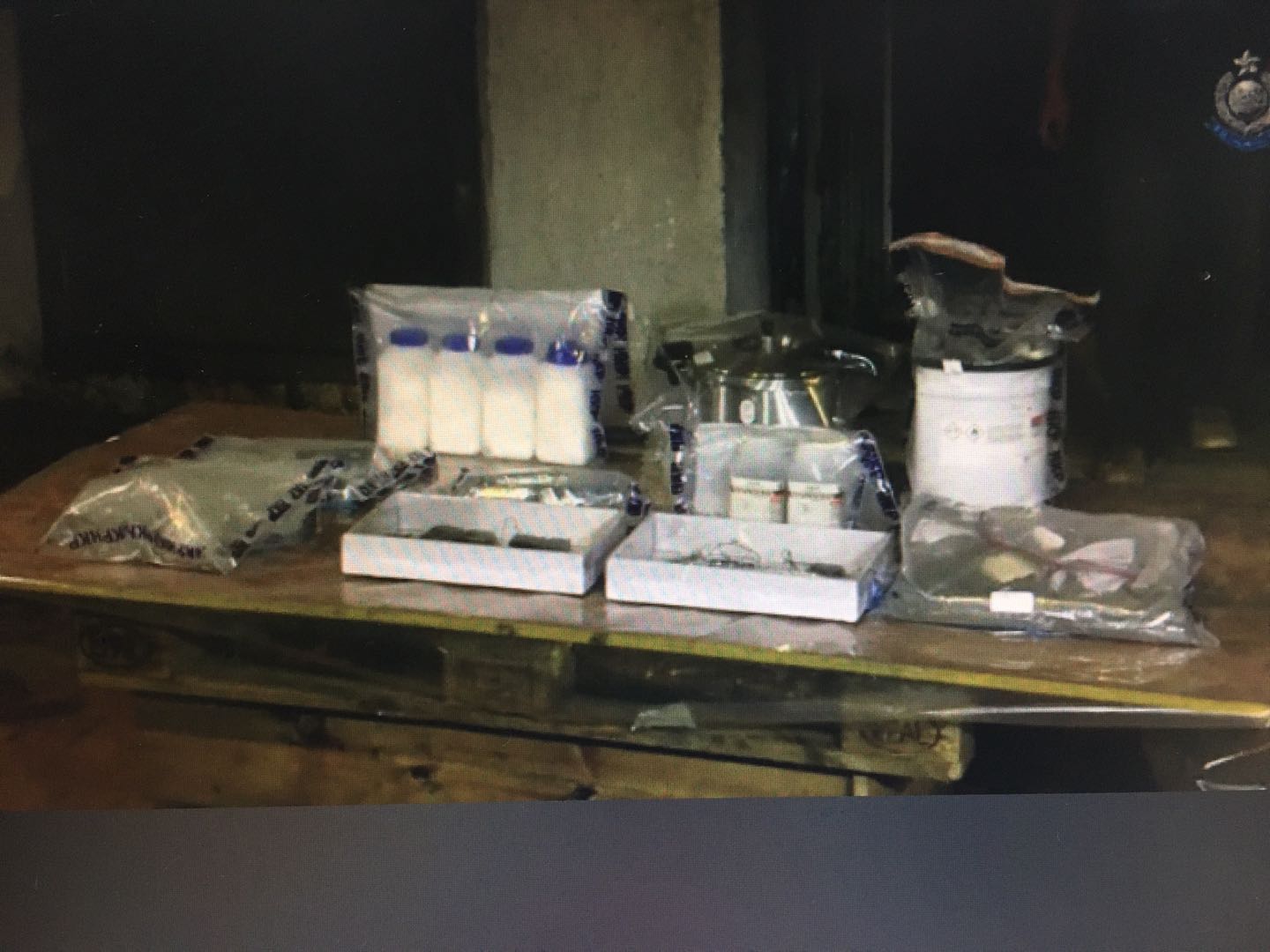 Video screenshot of Hong Kong police's press conference shows a homemade bomb, poisonous chemicals and a pressure cooker seized at a wasted school in Hong Kong, South China on May 2, 2020 (source: Hong Kong Police facebook account)