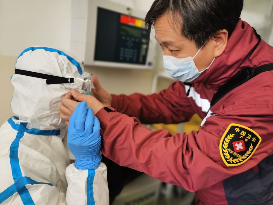 Peng Zhiqiang, head of the Chinese medical team in Serbia, helps a team member wear protective suit at a designated hospital for COVID-19 patients in Belgrade, Serbia, March 25, 2020. (Chinese medical expert team to Serbia/Handout via Xinhua)