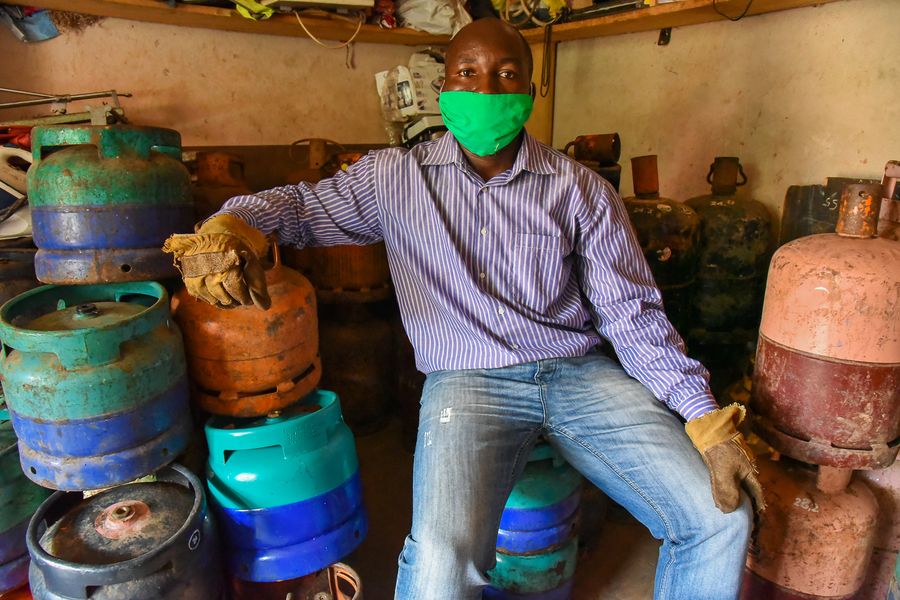 Aurelien Tchayep poses for a photo with tanks of liquified natural gas at his shop in Yaounde, Cameroon, April 22, 2020. (Photo by Jean Pierre Kepseu/Xinhua)