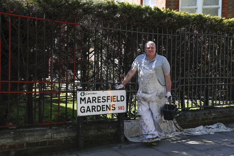 Mark Delaney paints the fence outside South Hampstead High School in London, Britain, April 21, 2020. (Xinhua/Han Yan)