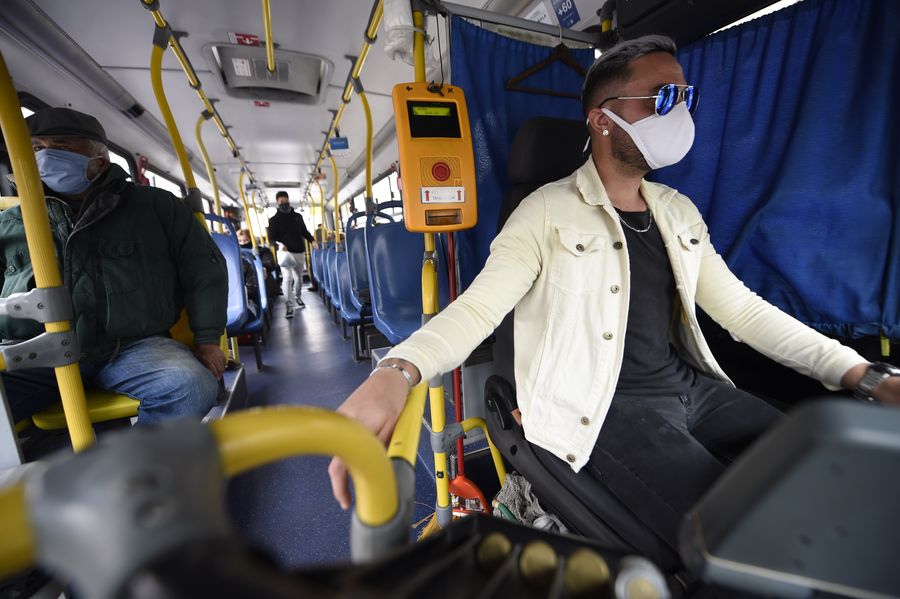 Bus driver Luis Mendez works in Montevideo, Uruguay, April 27, 2020. (Photo by Nicolas Celaya/Xinhua)