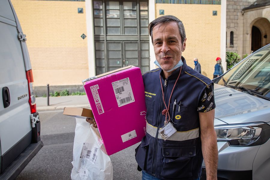 Delivery man Silverio Sergio works in Paris, France, April 21, 2020. (Photo by Aurelien Morissard/Xinhua)