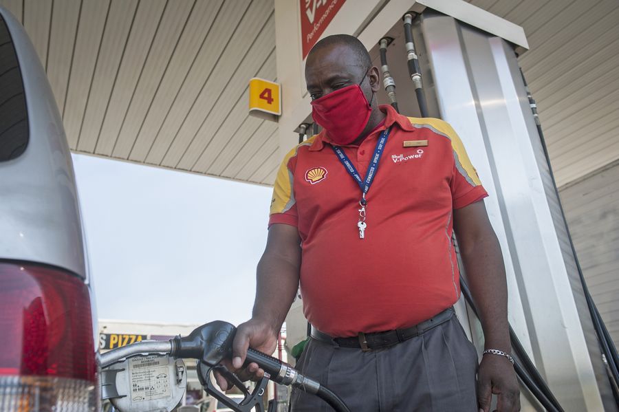 Gas station employee Fish works in Johannesburg, South Africa, April 22, 2020. (Photo by Shiraaz Mohamed/Xinhua)
