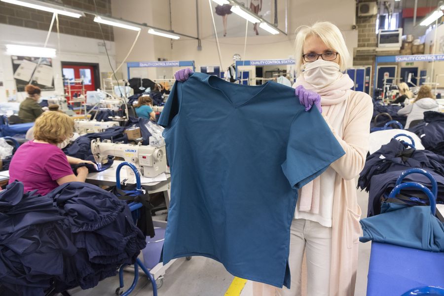 Fashion-Enter Ltd's factory production director Caroline Ash holds a top made for medical workers in London, Britain, April 17, 2020. (Photo by Ray Tang/Xinhua)