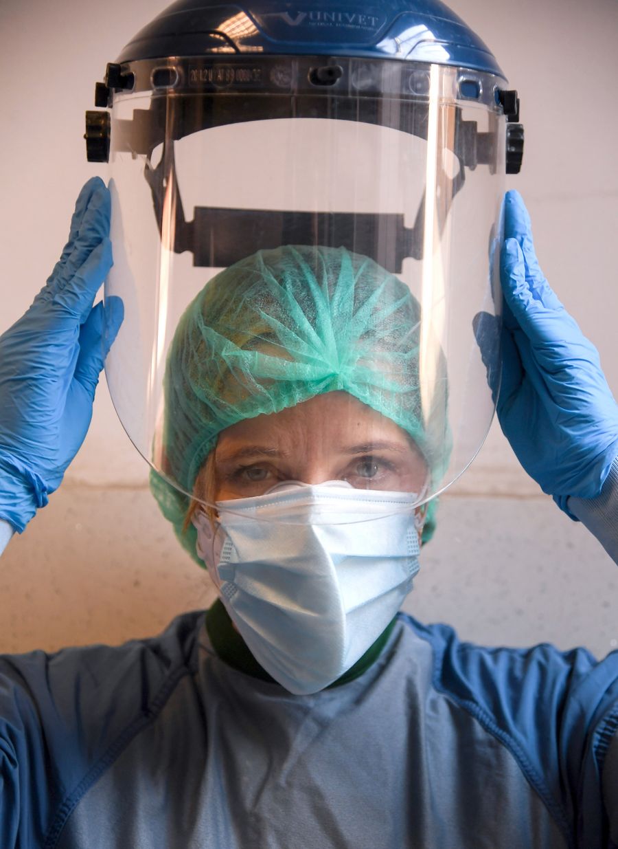Doctor Monica Carfora puts on protective equipment before entering the COVID-19 department at Santo Spirito Hospital in Rome, Italy, April 12, 2020. (Photo by Alberto Lingria/Xinhua)