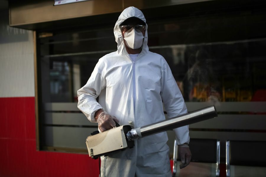 Sanitation worker Oscar Javier carries out disinfection work in Bogota, Colombia, April 29, 2020. (Photo by Jhon Paz/Xinhua)