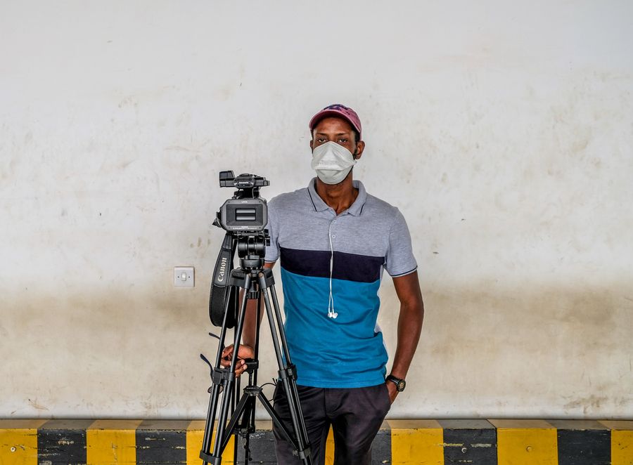 Reporter Abdoulaye Dabo works at an airport in Dakar, Senegal, April 20, 2020. (Photo by Eddy Peters/Xinhua)