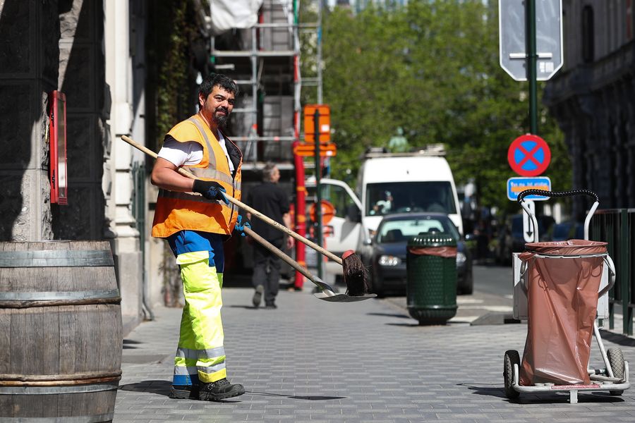 Sanitation worker Goffin Thierry works on a street in Brussels, Belgium, April 21, 2020. (Xinhua/Zheng Huansong)