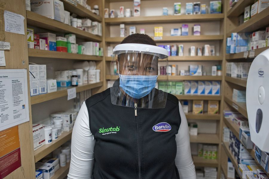Pharmacist Vivien works at a pharmacy in Johannesburg, South Africa, April 22, 2020. (Photo by Shiraaz Mohamed/Xinhua)■