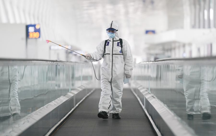 A firefighter conducts disinfection at the Wuhan Tianhe International Airport in Wuhan, central China's Hubei Province, April 3, 2020. (Xinhua/Cheng Min)