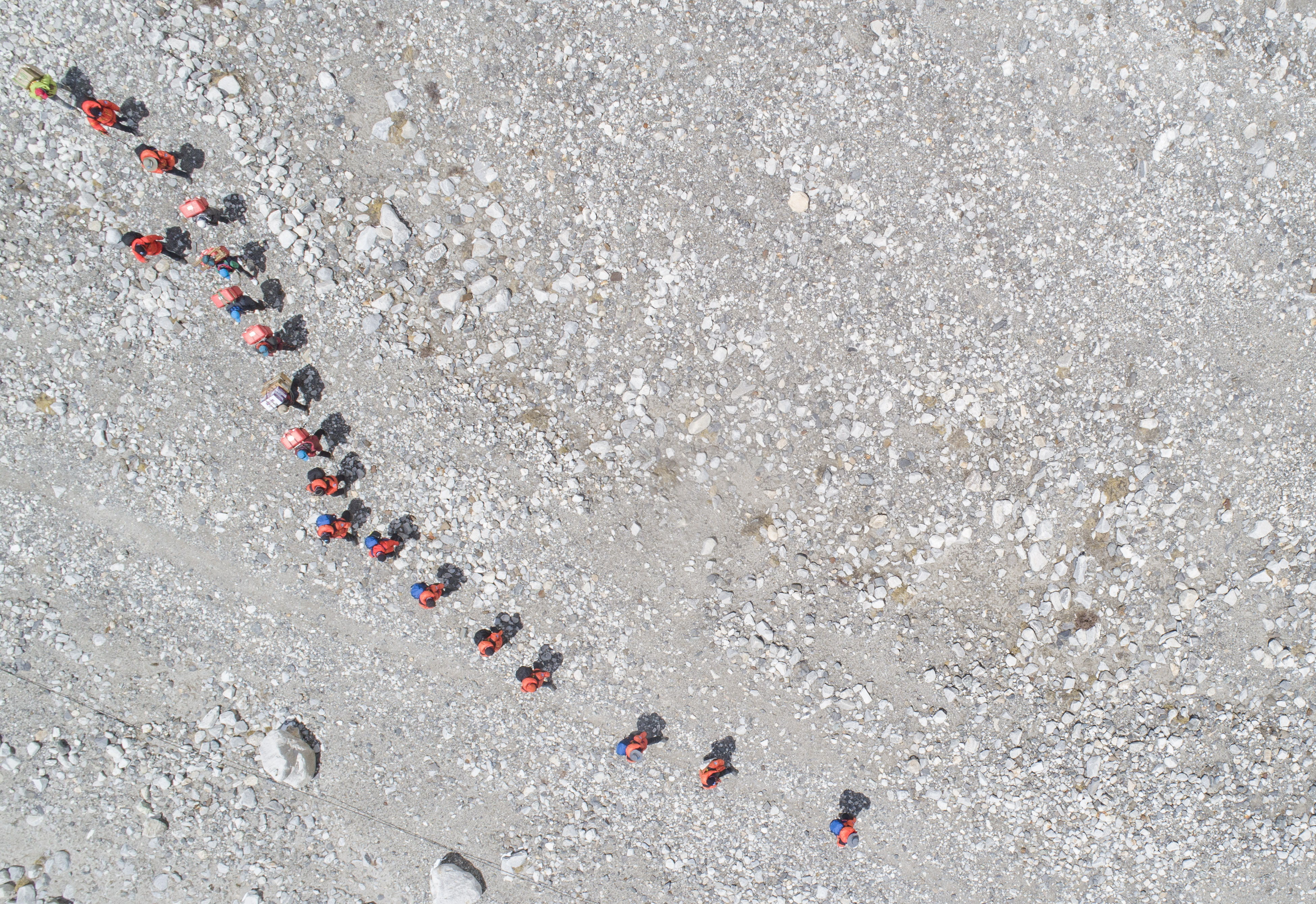 Xue Qiangqiang and his teammates depart from the base camp of Mount Qomolangma in southwest China's Tibet Autonomous Region, in this aerial photo taken on May 2, 2020. (Xinhua/Jigme Dorje)