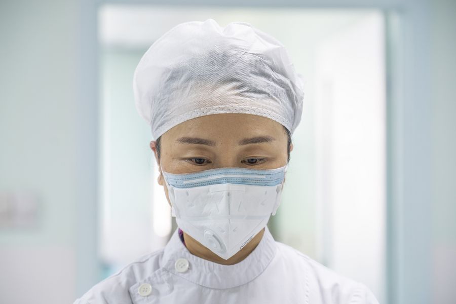 A medical worker pays a silent tribute to martyrs who died in the fight against the novel coronavirus disease (COVID-19) outbreak and compatriots who died of the disease in Wuhan, central China's Hubei Province, April 4, 2020. (Xinhua/Cai Yang)
