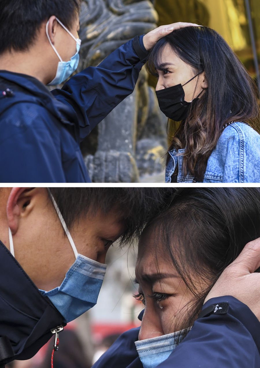 The upper part of this combo photo taken on April 23, 2020 shows Lyu Jun (L), a member of a medical team supporting the novel coronavirus-hit Hubei Province, reuniting with his fiancee Wang He in Urumqi, northwest China's Xinjiang Uygur Autonomous Region. The lower part of the combo photo taken on Jan. 28, 2020 shows Lyu Jun (L) saying goodbye to Wang He before leaving for Hubei Province at Xinjiang Medical University in Urumqi. (Xinhua/Wang Fei)
